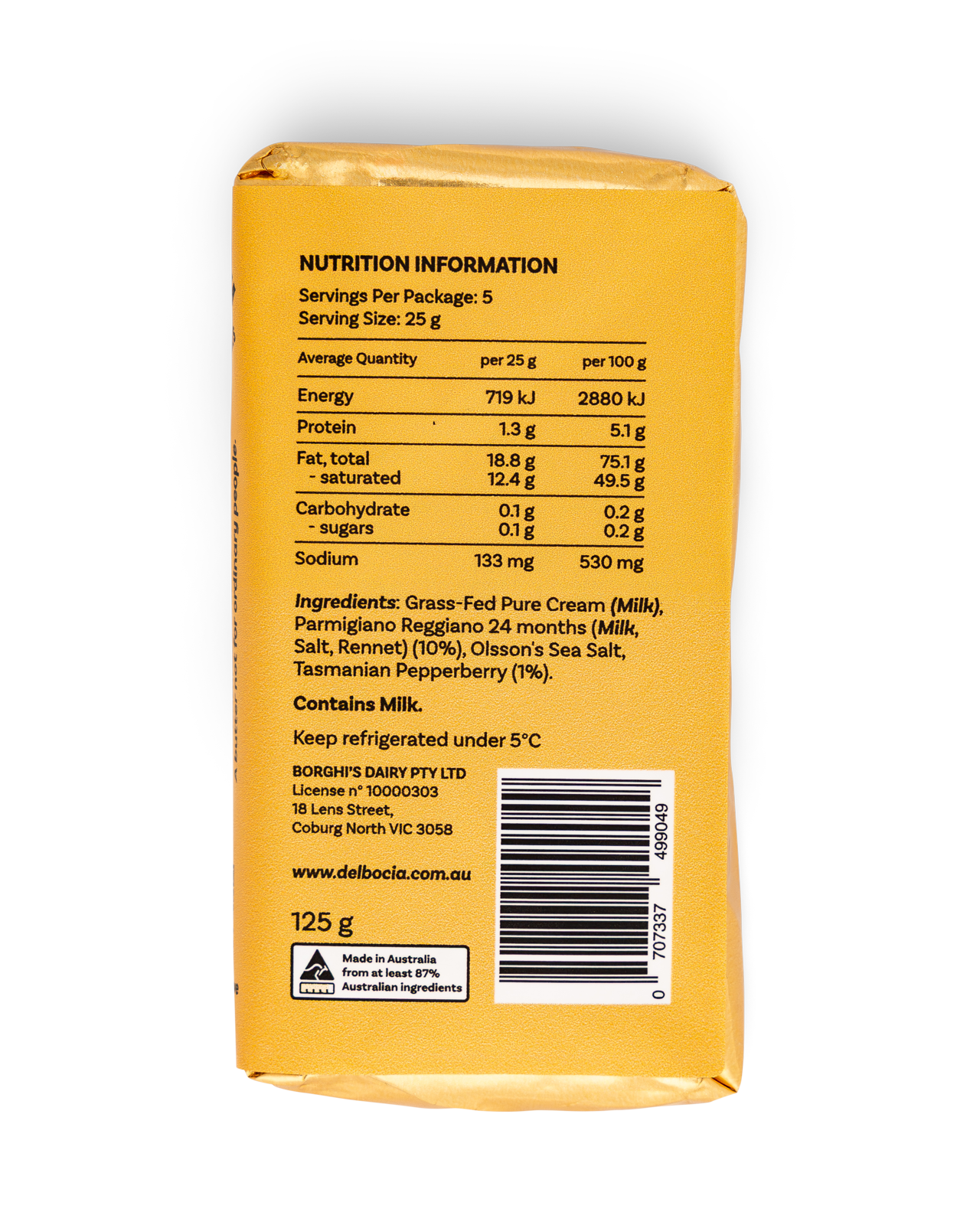 Parmigiano Reggiano 24 months and Tasmanian pepperberry blended with grass-fed Victorian cream.