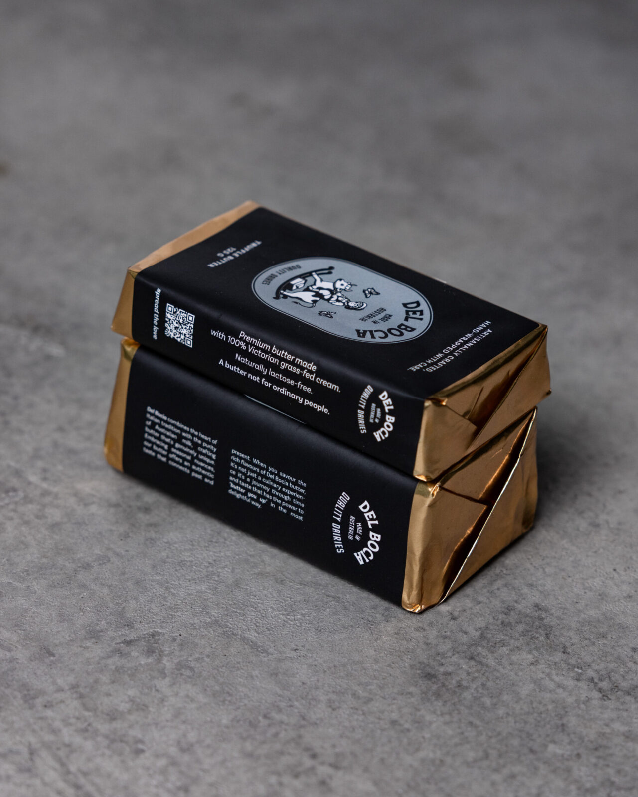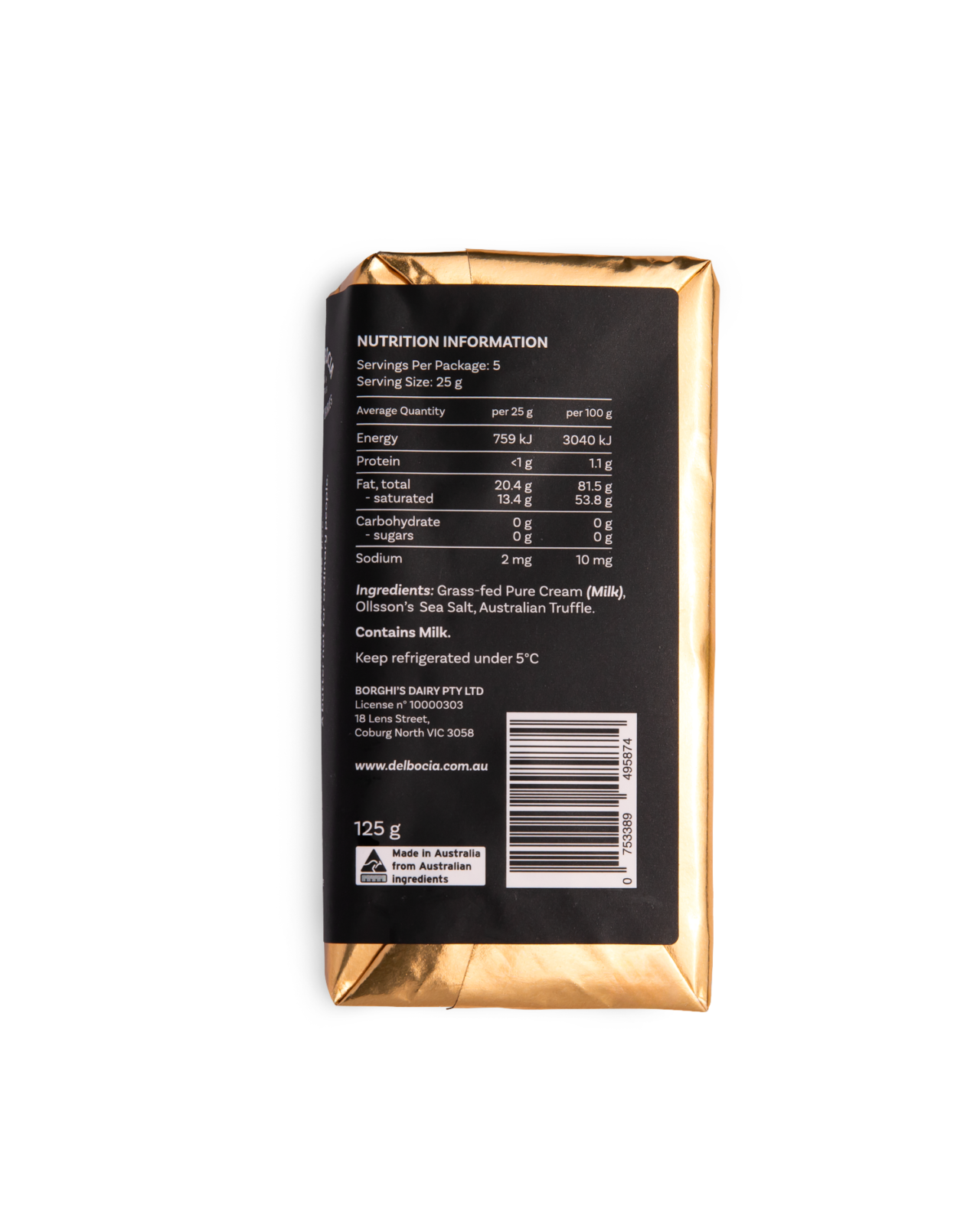 Our Truffle Butter combines rich cream from Victoria’s lush pastures with premium Western Australian truffles. The cows’ year-round green diet gives our butter its bright yellow hue and top-quality flavour. Made the traditional way, this butter offers a luxurious truffle infusion. It’s perfect on its own with bread, in risottos, and pastas.